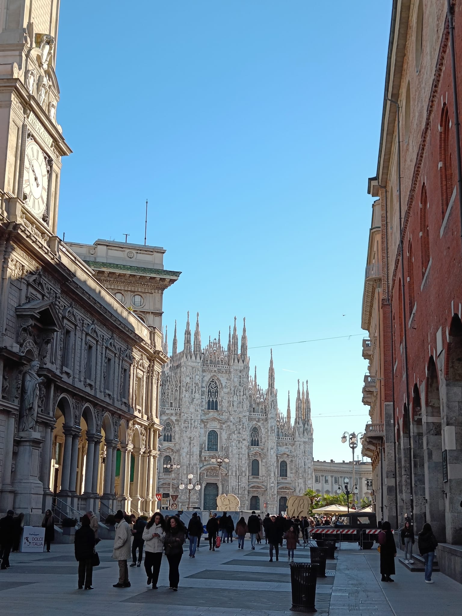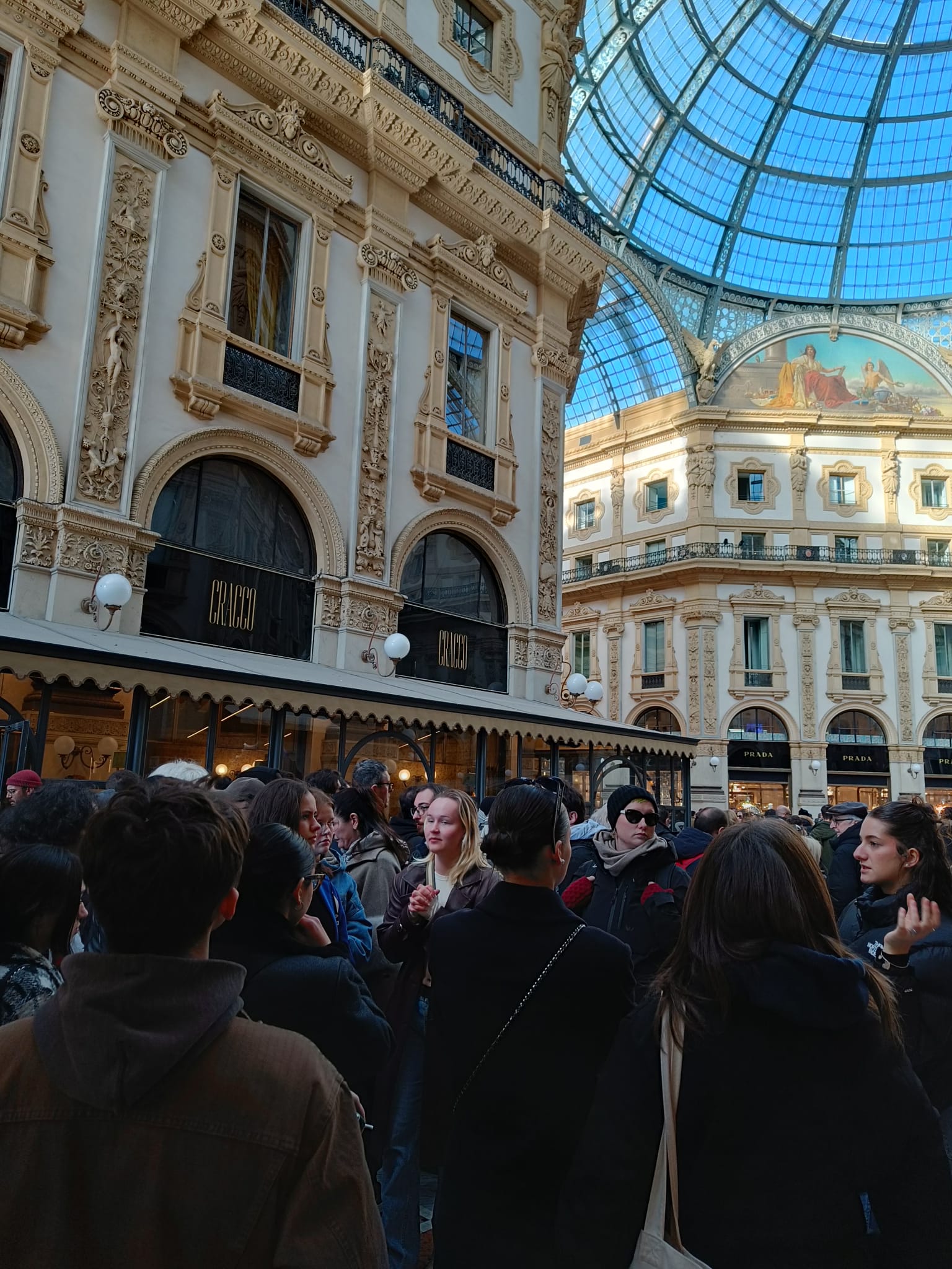 Tapasimme Milanon Il Duomon portailla ja pääsimme heti suoraan toimintaan - Kiipesimme 150 porrasta katedraalin katolle ja tuijottelimme siellä hetken. Sen jälkeen pääsimme katedraaliin sisälle seuraamaan katolista messua. Tämän jälkeen kävelimme Vittorio Emmanuellen lasikaton alla tuhannen muun ihmisen kanssa.