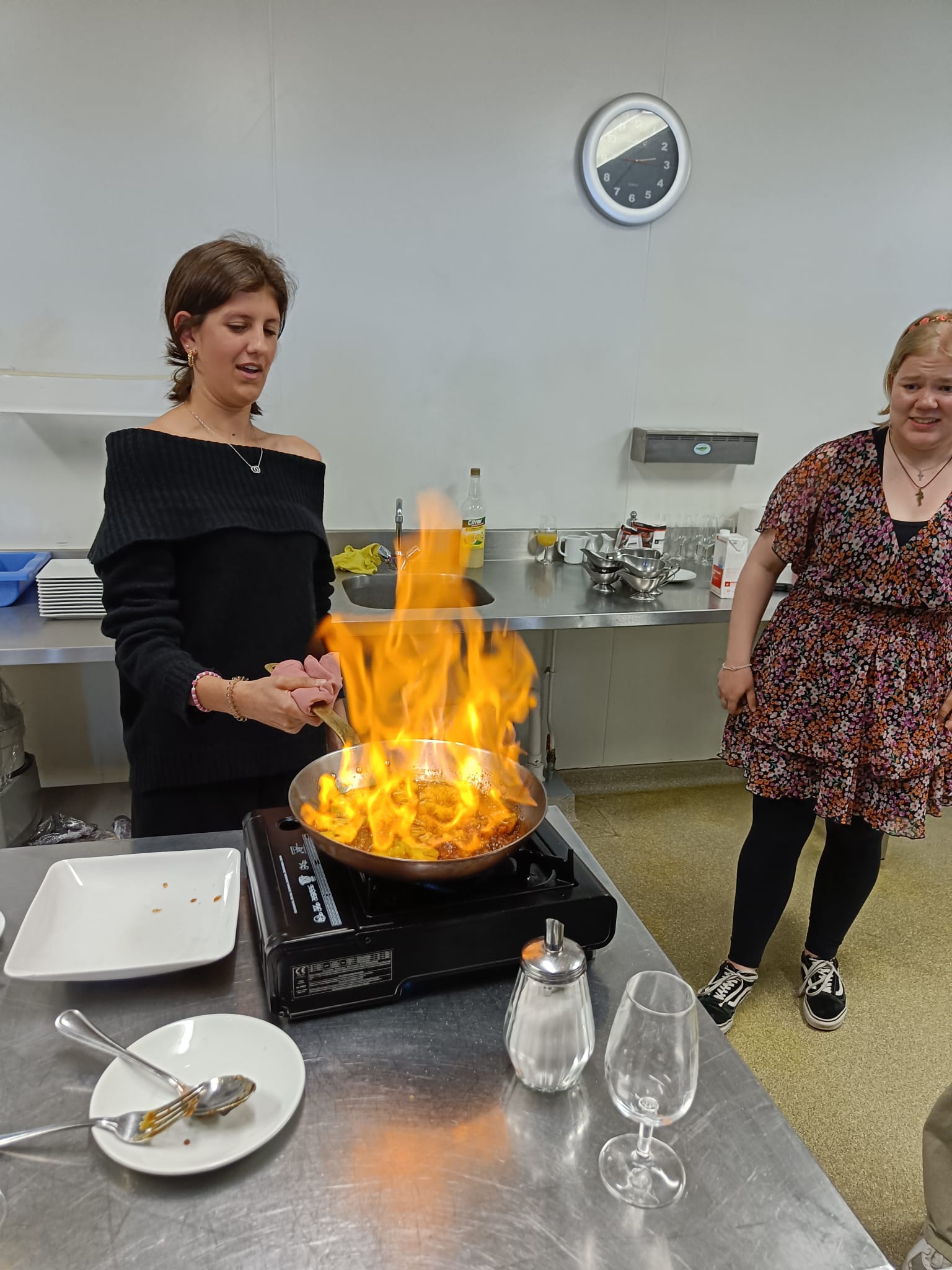 After the project work presentation, we had a food related workshop. We split into 2 groups - one was learning how to flambe and one was making mocktails (cocktails without alcohol). And then we switched, so that everyone got to try both things. Making the mocktails was easy and fun and the final result was like from a tropical isöland beach. Flambe was a bit more scary, because sometimes the flames were as tall as the kitchen room. But we all survived with hair and eyelashes intact.