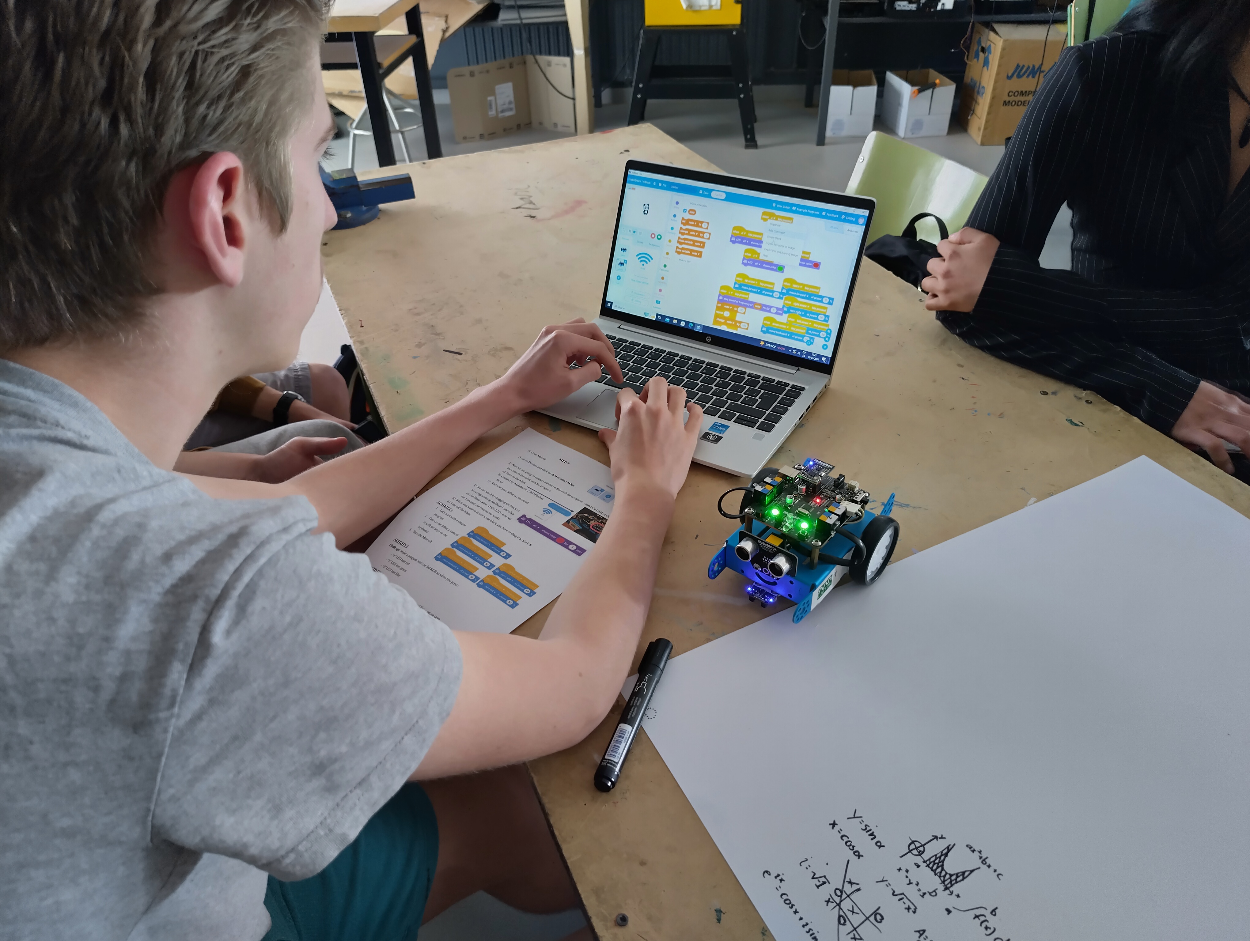Our day started at school, split into two groups. One undertook a programming class whilst another took part in a robotics class. In the programming class, students were given access to a coding software and an electronics ‘briefcase’. The briefcase had a multitude of different tools which the students taught to sing a variety of songs, but the main task was to train the briefcase to be an ultrasonic sound sensor which could detect when it was too close to an object. The idea was to be able to use it as a tool to help the visually impaired navigate a foreign environment safely.