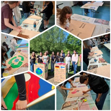 We played some ice breaking games outside. After that we gathered to hear about our task, which was to design and paint a recycling box for bottles and cans.