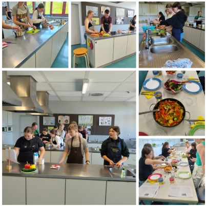 We cooked a traditional German meal, salad and dessert. It was great co-operation and the lunch was really delicious. Also the teachers enjoyed our cookings.
