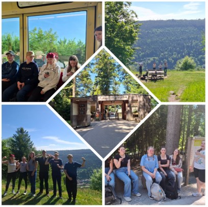At 9.00 o’clock we travelled by train to Black Forest. We walked to the top of the adjacent cliff along the paths in the forest. At the top of the cliff there were buildings and roads where you could drive a car and walk. We walked to a 55 meters high tower that we climbed up . There was also a long slide for “tobogogging”. We sled it down. We left the tower and headed back towards the buildings at the top of the cliff. After reaching the buildings we bought train tickets back down. The train was short, moved slowly and went down a steep slope. When we got back down we looked for a suitable restaurant and had lunch there. After lunch we bought ice creams and took the train to Königsbach. In Königsbach we went bowling and had a pizza dinner.