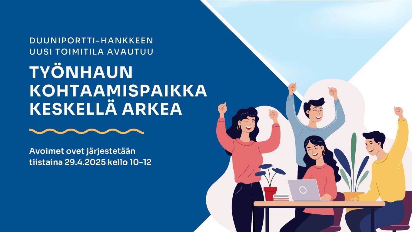 Julkaistu 17.4.2025 Muokattu 24.4.2025Duuniportti-hanke saa uuden kodin! Meillä on ilo ilmoittaa, että hankkeen toimitila avataan tiistaina 29.4.2025. Se tulee toimimaan työnhakijoiden, työnantajien ja asiantuntijoiden keskeisenä kohtaamispaikkana hankkeen ajan.