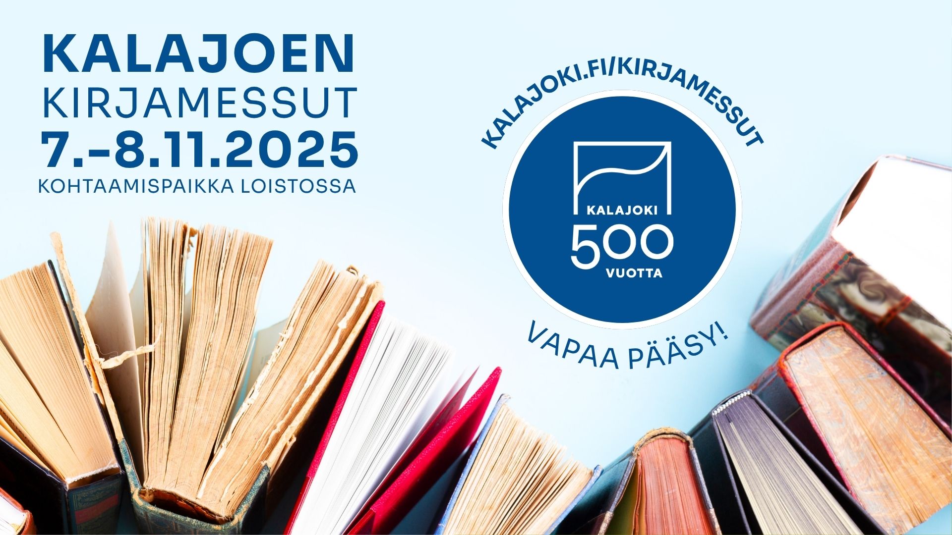 Haastattelujen ja ohjelman ohella messuilla näytteilleasettajia. Kalajoki 500 -juhlavuoden kunniaksi kirjamessuille vapaa pääsy!