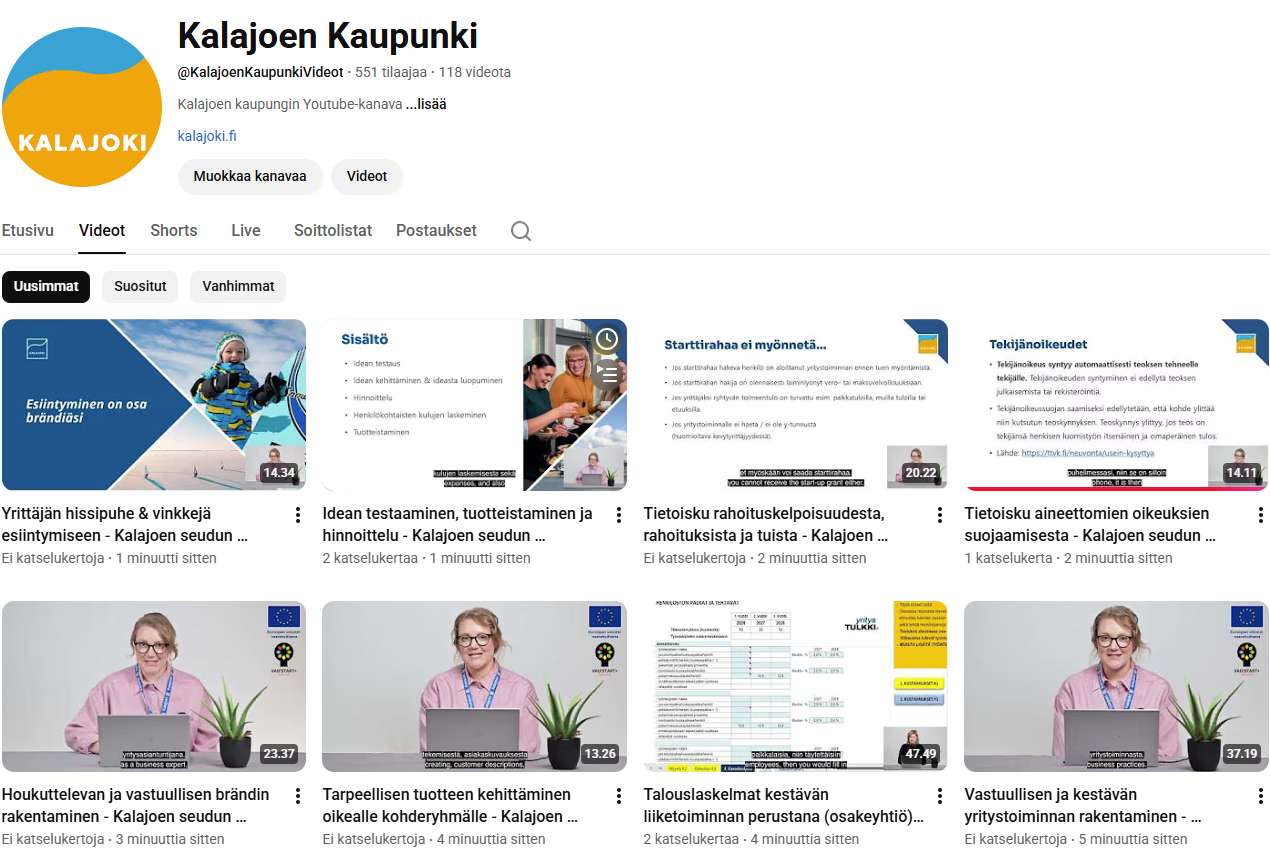Yrittäjien, yritysten ja yrittäjyydestä kiinnostuneiden tueksi on julkaistu kahdeksan videoita, jotka käsittelevät niin yrityksen perustamiseen ja idean kehittämiseen liittyviä aiheita. Videot ovat katsottavissa Kalajoen kaupungin Youtube-kanavalta. https://www.youtube.com/@KalajoenKaupunkiVideot/videos