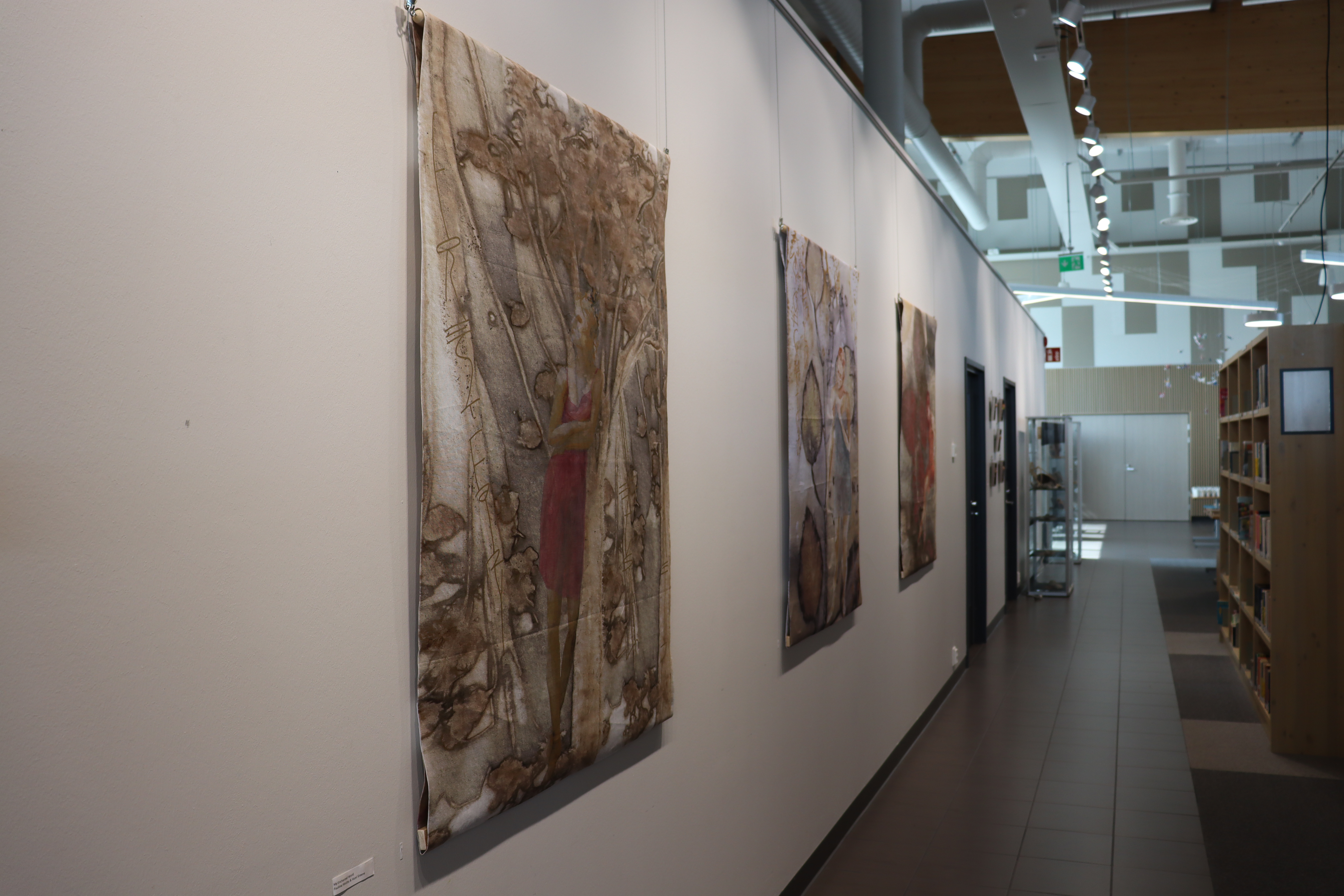 Seinätila on varustettu kohdevaloilla, ripustuskiskolla ja -vaijereilla. Lisää seinätilaa saa tarvittaessa kirjaston muilta seiniltä.