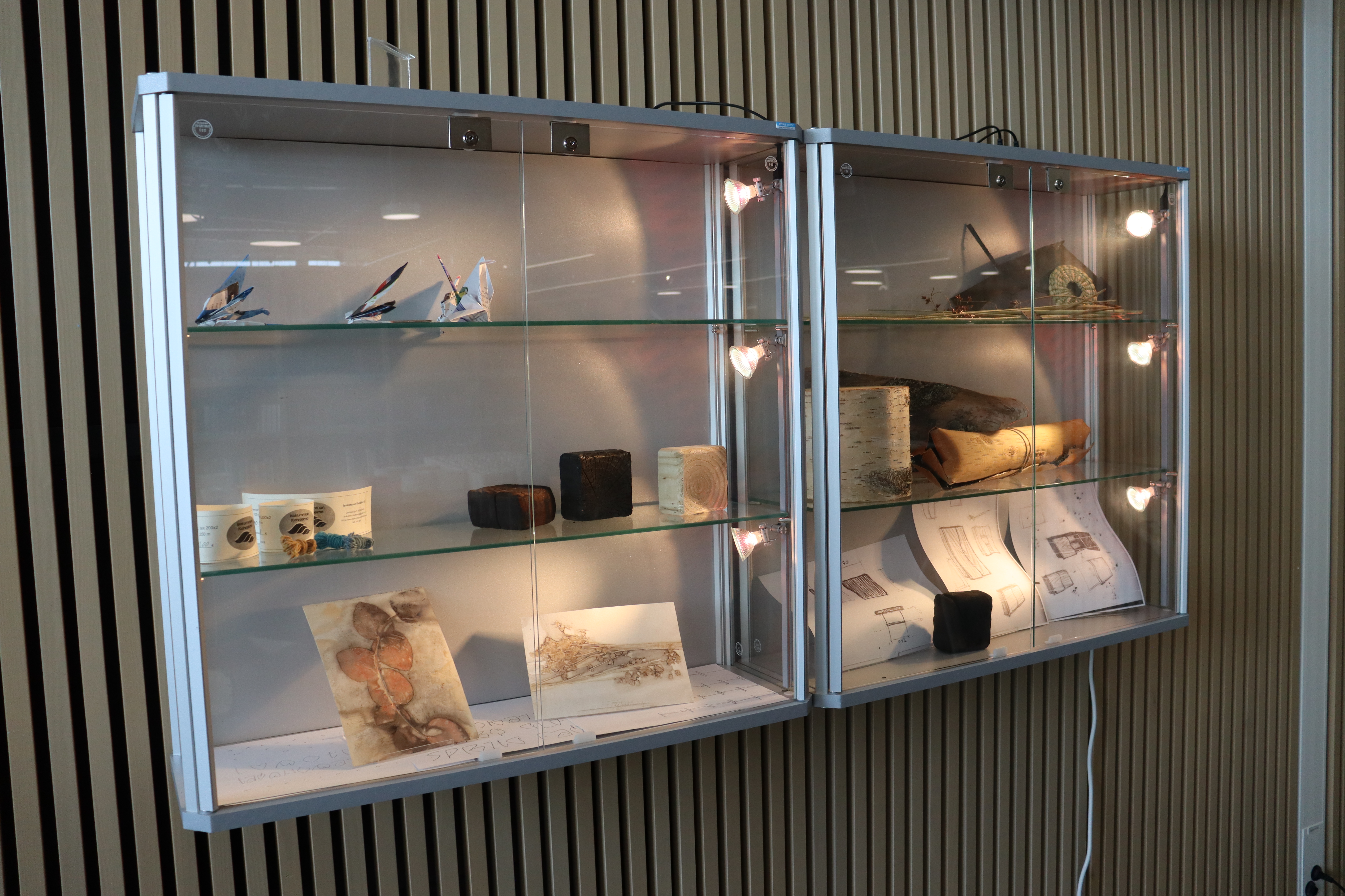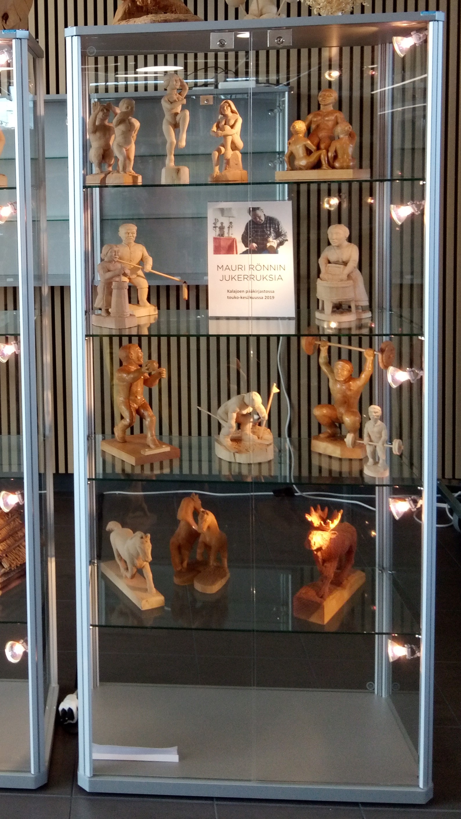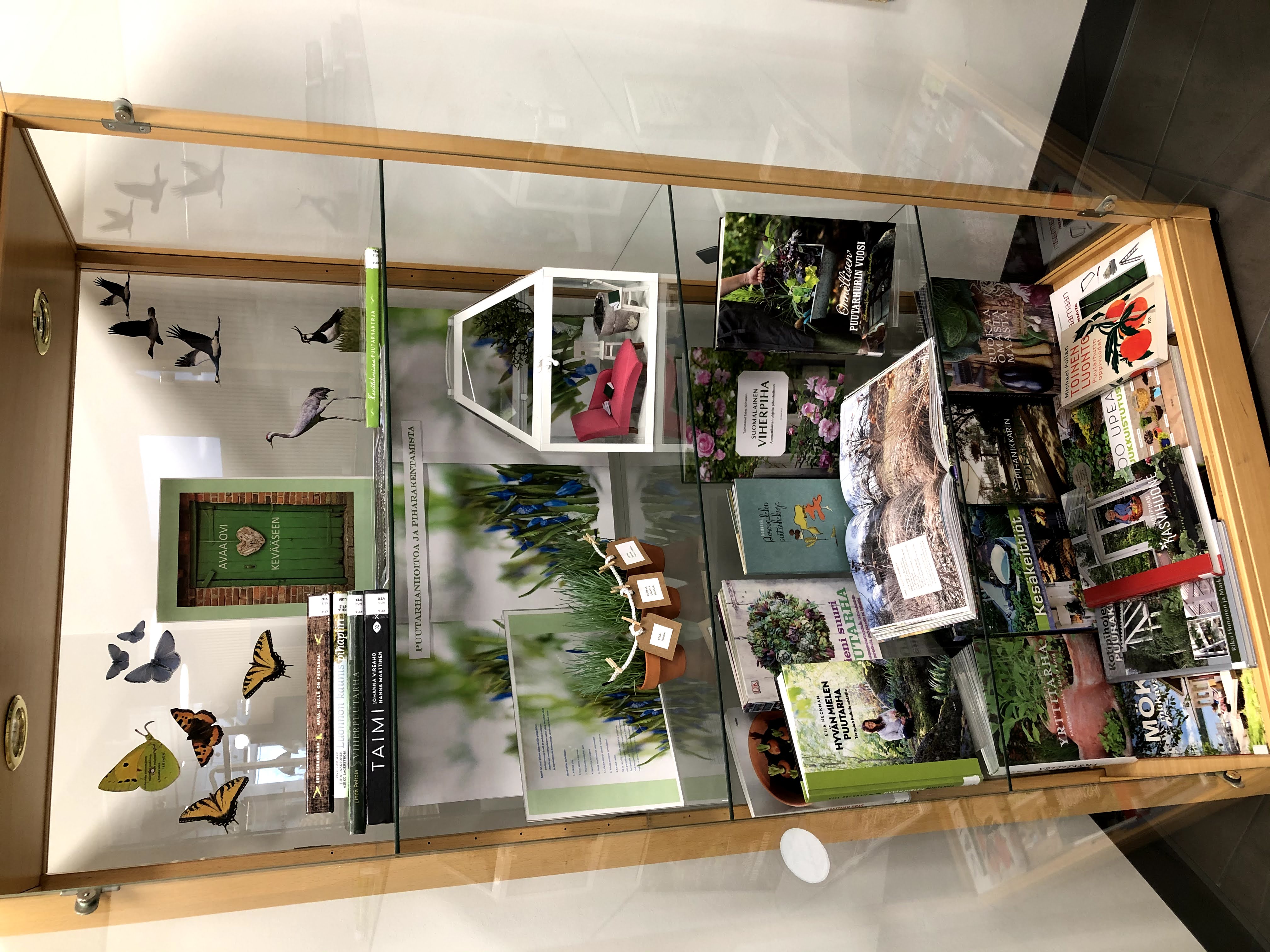Kirjastossa on myös yksi puurunkoinen vitriini (ulkomitat 90 x 40 x 180 cm).