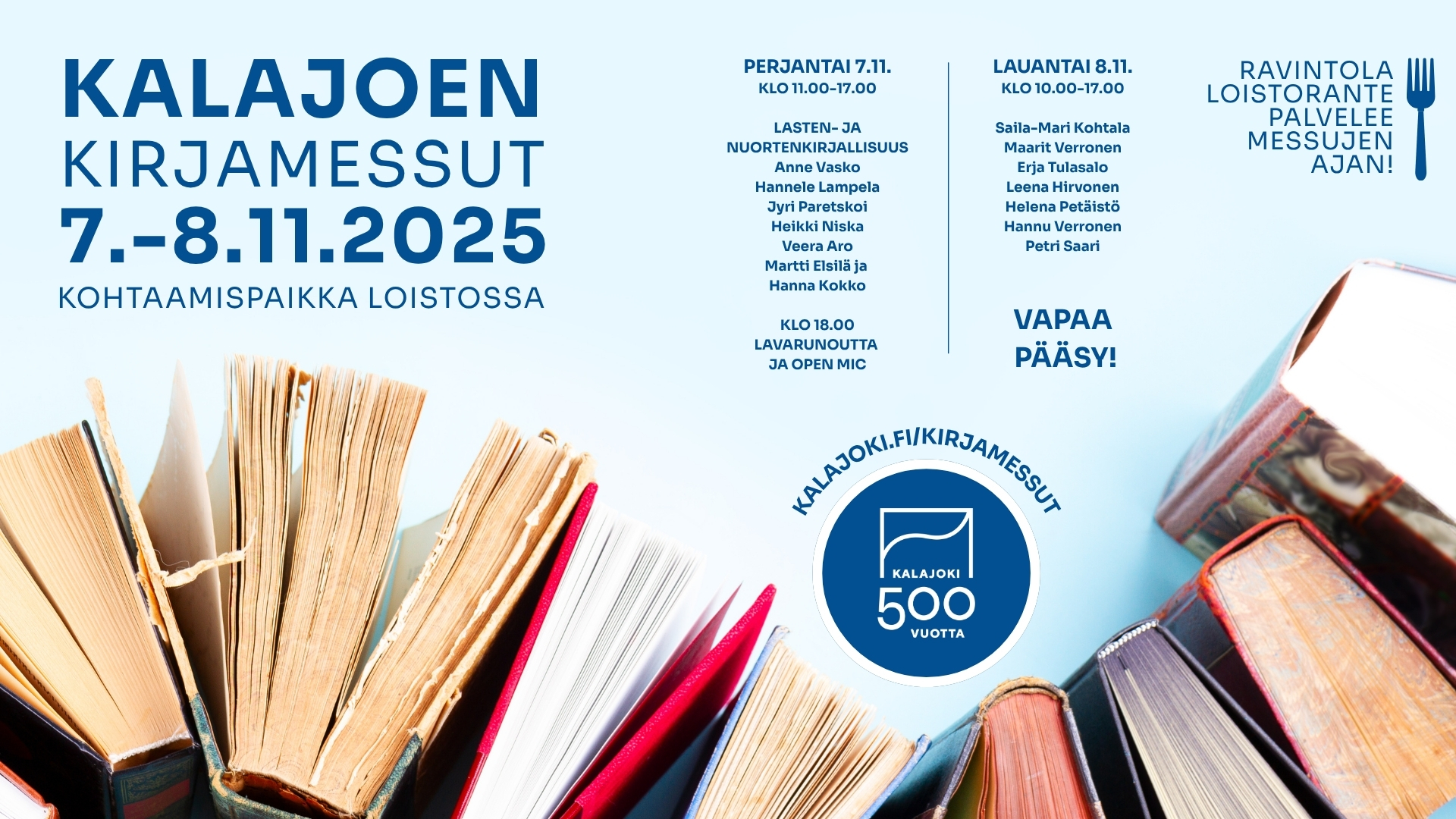 Kalajoen ensimmäisille kirjamessuille Kohtaamispaikka Loistoon saapuu monipuolinen joukko kirjailijoita. Kalajoki 500 Juhlavuoden teeman mukaan kirjailijavieraat ovat joko kotoisin Kalajoelta, heillä on yhteys paikkakuntaan, tai jokin teos heidän tuotannossaan liittyy Kalajokeen.