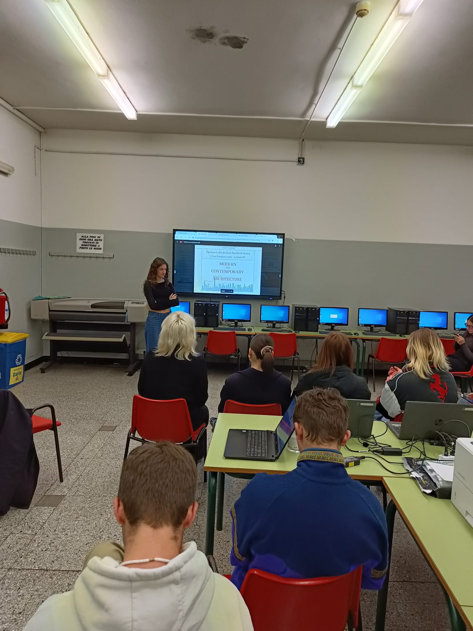Työskentelimme koululla arkkitehtuuriprojektin kanssa. Kiersimme koulun, joimme kahvit ja aloimme hommiin. Täyttelimme lapun, jossa käytiin läpi tärkeimpiä arkkitehtuuriin liittyviä sanoja suomeksi ja italiaksi, harjoittelimme suomen vokaalit ja kuulimme mielenkiintoisen alustuksen siitä, mitä sana “design” tarkoittaa, sillä tärkeintä eivät ole materiaalivalinnat tai tyyli, vaan rakennuksen toimivuus ja käyttäjäystävällisyys. Keskustelimme aiheesta.