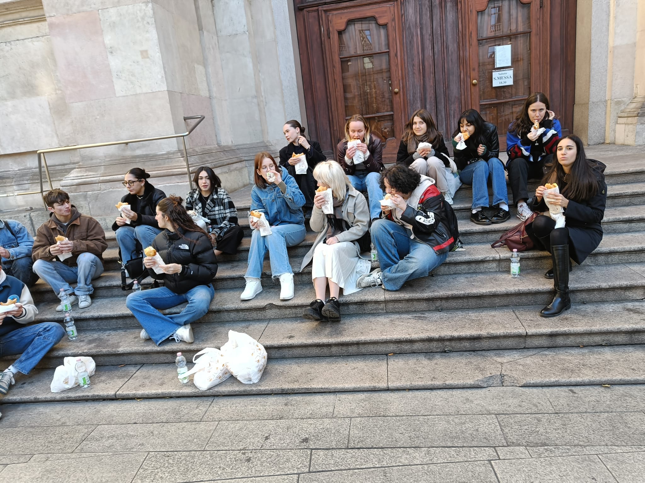 Tapasimme Milanon Il Duomon portailla ja pääsimme heti suoraan toimintaan - Kiipesimme 150 porrasta katedraalin katolle ja tuijottelimme siellä hetken. Sen jälkeen pääsimme katedraaliin sisälle seuraamaan katolista messua. Tämän jälkeen kävelimme Vittorio Emmanuellen lasikaton alla tuhannen muun ihmisen kanssa.