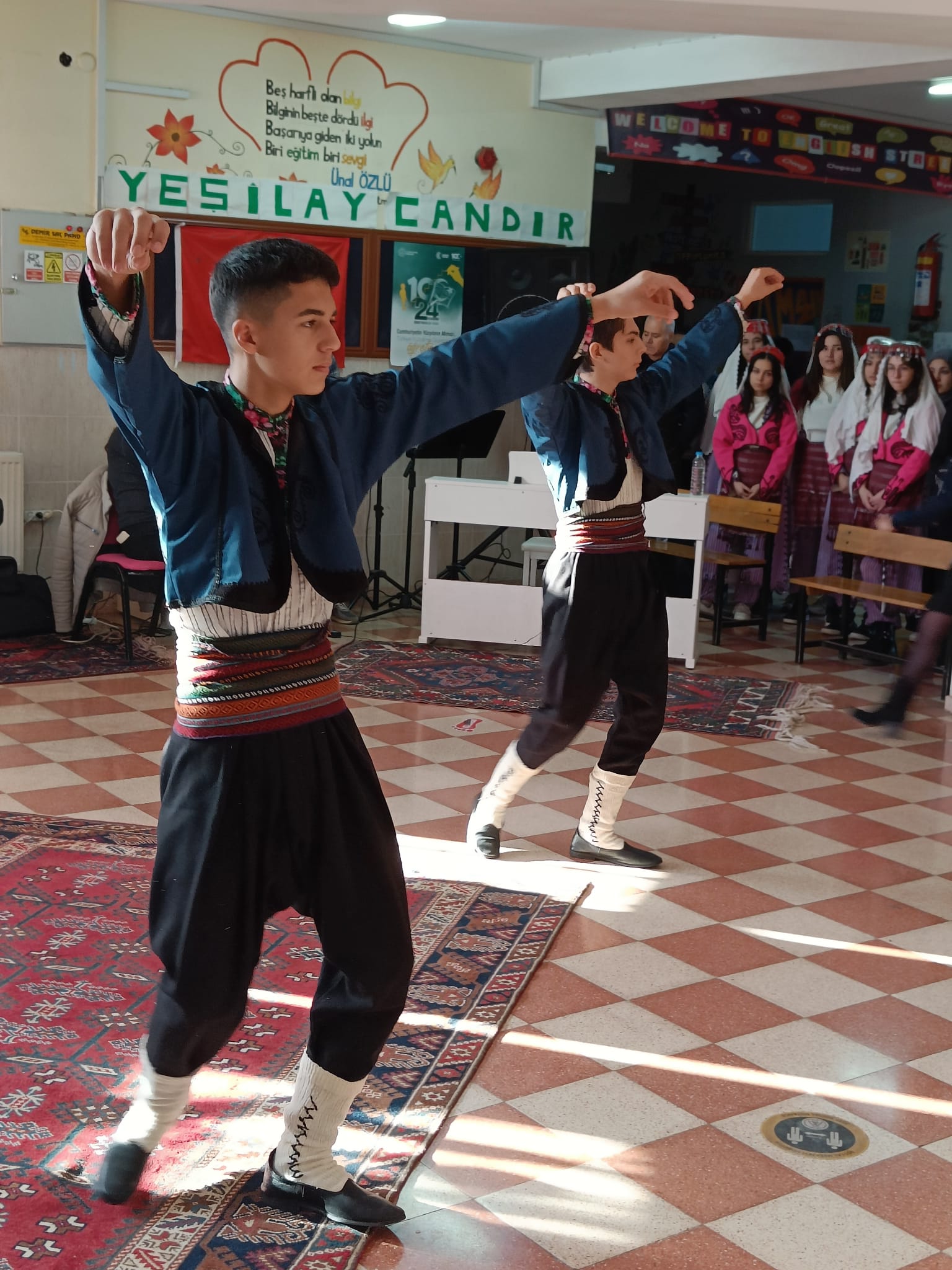 We visited a different school today and received a warm welcome. There was a band playing traditional Turkish music using traditional instruments, we watched and learned traditional folk dances and at the end learned how to make the Turkish carpet. Each symbol at the carpet has a different meaning and so they tell a story when "read" properly. After the welcome we had a moment of artistic improvisation and creativity by expanding a picture of Antalya with our imagination. It was fun and the results were like from a gallery :)