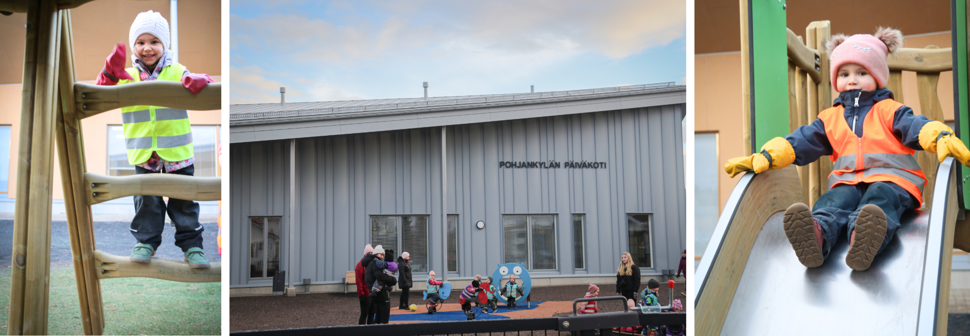 Erin Vatunki, 4, on lähdössä ryhmänsä kanssa käymään kirjastossa, mutta ennen pientä jalkapatikkaa on hetki aikaa leikkiä pihalla. Pihalta löytyy myös pikkusisko Kira Vatunki, 3, jonka kanssa voi ottaa hyvät vauhdit liukumäessä. Sisarukset kiipeävät mäelle vikkelästi ja kertovat, että uuden päiväkodin myötä heidän arkeensa on vanhojen tuttujen lisäksi tullut myös uusia kavereita ja aikuisia. Saman kokemuksen jakavat useimmat päiväkodin lapset.