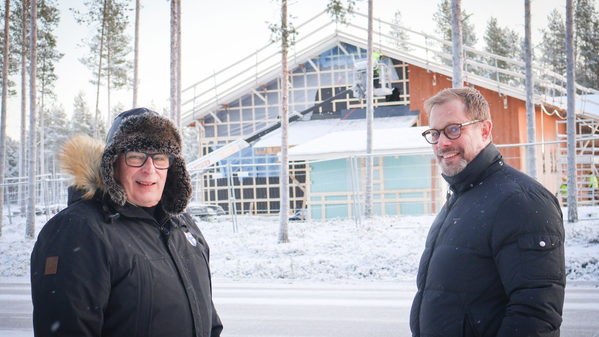 Kaupunginjohtaja Jukka Puoskari ja Päiväkoti Arkin toimitusjohtaja Niko Rantanen iloitsevat Hiekkasärkkien ensimmäisestä päiväkodista. Puoskari heittäytyi tekemään lumienkelin uuden päiväkodin ja sen tulevien asiakkaiden turvaksi.