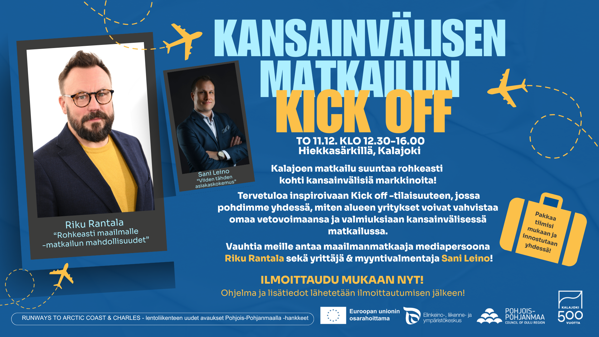 Hankkeen käynnistystä juhlistetaan maksuttomalla Kansainvälisen matkailun Kick Off -tilaisuudella, johon kutsutaan Kalajoen ja lähialueiden matkailualan toimijat, yrittäjät ja asiantuntijat. Tilaisuus tarjoaa inspiroivia puheenvuoroja, konkreettisia työkaluja kansainvälistymiseen sekä mahdollisuuden verkostoitua uuden hankkeen ympärille.