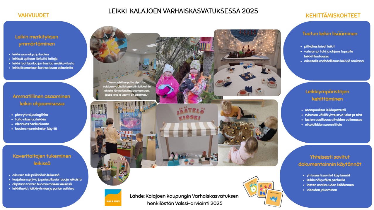 Valssi-arviointi tulee jatkumaan syksyllä 2026. Kalajoen varhaiskasvatuksen toimipaikat (kunnalliset ja yksityiset päiväkodit) ja perhepäivähoito ovat mukana myös varhaiskasvatuksen kansallinen arvioinnissa. Aiheena on kolmevuotiaiden ja sitä nuorempien lasten varhaiskasvatus. Arvioinnin tiedonkeruu toteutetaan Valssi-järjestelmällä lokakuussa 2026.