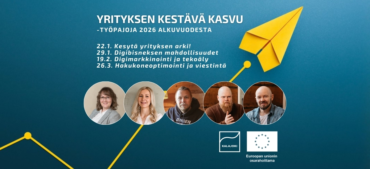 Yrityksen kestävä kasvu -työpajojen alkuvuoden teemat tarjoavat kehittämisen mahdollisuuksia kaiken kokoisten yritysten toiminnan uudistamiseen sekä internetnäkyvyyden vahvistamiseen. Työpajat ovat maksuttomia ja tarjoavat tilaisuuden verkostoitua muiden yrittäjien kanssa. Työpajoista saat käytännönläheisiä työkaluja ja sparrausta, joiden avulla ideat muuttuvat toiminnaksi heti arjessa. Jokainen työpaja on oma kokonaisuutensa, joten voit osallistua kaikkiin tai poimia joukosta kiinnostavimmat.