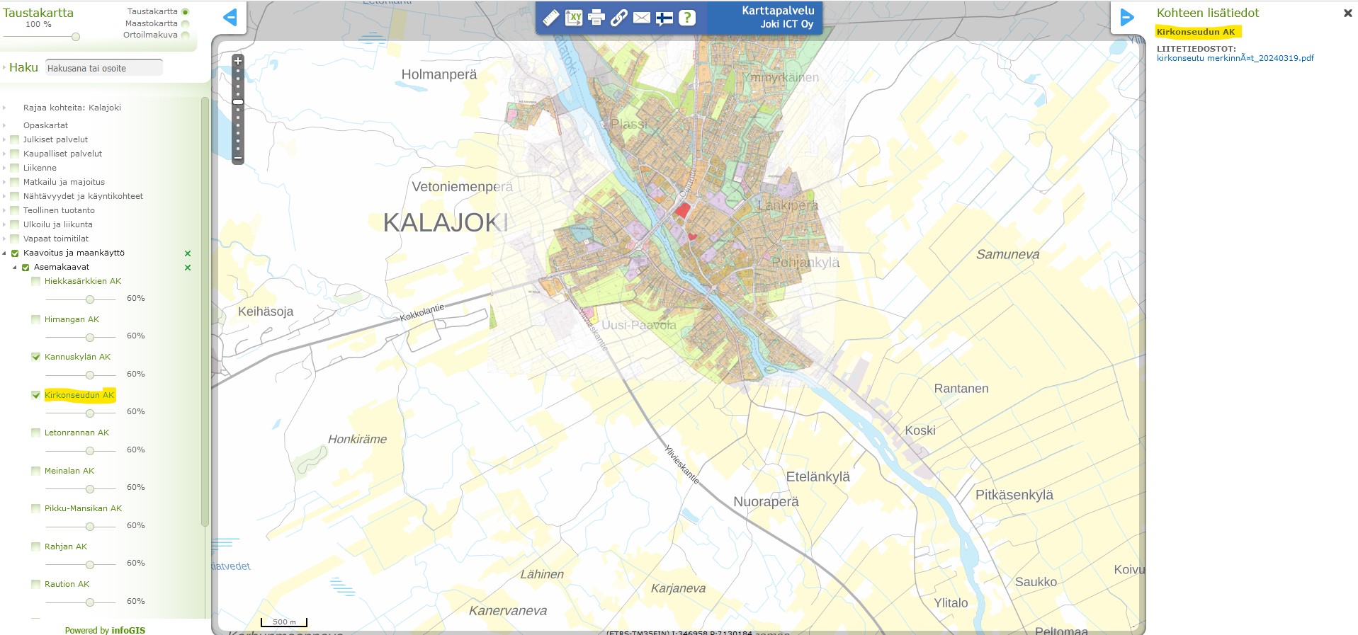 Karttapalvelun sivun vasemman reunan valikossa on karttataso "Kaavoitus ja maankäyttö", jonka alla tasot "Asemakaavat", "Ranta-asemakaavat" ja "Osayleiskaavat". Näiden tasojen alta löytyvät aluekohtaiset kaavayhdistelmät, jotka saat kartalle piirtymään aktivoimalla karttatason klikkaamalla karttatason nimen edessä olevaa laatikkoa. Klikkaamalla aluekohtaisen kaavan nimeä aukeaa sivun oikeaan yläkulmaan "Kohteen lisätiedot" osio, jonka alle tulee linkki valitun kaavan dokumenttiin josta aukeaa Kalajoen kaupungin ajantasainen kaavayhdistelmä kaavamerkintöjen selityksillä.